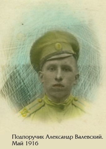Александр Николаевич Валевский родился в Симбирске в 1896 году. Выпускник кадетского корпуса, вышедший из семьи, где все с честью несли военную службу, Валевский не представлял для себя иной судьбы. В 1915 году, после окончания Симбирского кадетского корпуса и краткосрочных курсов в Александровском военном училище, он был направлен в действующую армию. Прапорщик, а в 1916 году уже подпоручик 335-го пехотного Анапского полка А.Н. Валевский сражался на Юго-Западном фронте. 21 августа 1916 года в местечке при деревне Кабаровке на территории Австро-Венгрии он получил сквозное ранение шеи и после лечения в госпитале и отпуска по ранению в Симбирске вновь вернулся на поля сражений.