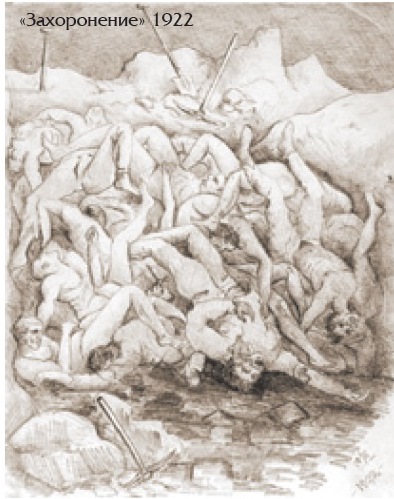 В рисунках Валевского множество раз возникает образ смерти. Это изображение «бутафорского смешного экипажика» из песни Вертинского, плакатный образ смерти в виде одетого в чёрный саван скелета, размахивающего косой у постели умирающего. Это смерть павших на поле боя воинов XIX столетия, о которых помнят и скорбят оставшиеся в живых товарищи, и изображение это подписывается строчками ещё одной популярной песни на слова стихотворения В. Жуковского «Спите. Бог не спит за вас». Но самый страшный образ смерти – это изображение братской могилы, где обнажённые безымянные человеческие тела свалены в страшную кучу. Потеря ценности человеческой жизни оборачивается обесцениванием смерти. И это тоже лицо эпохи.